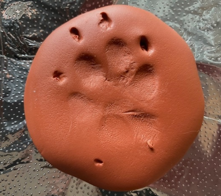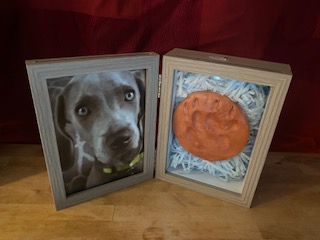 Paw imprint mounted on hand crafted desktop frame. We believe that each paw print is as unique as the pet it represents. So we create them using terra cotta clay that is infused with an organic oil. This unique process produces a paw impression with stunning details of your pet’s paw. On the adjacent frame, we mount a high resolution photogra We have included a close up shot of one to show you.
